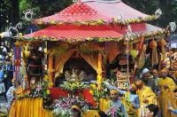 | Kim quan thầy trên chiếc xe được trang trí rực rỡ, có 4 vị Tứ thiên hộ pháp đứng 4 góc. |