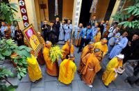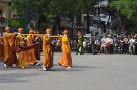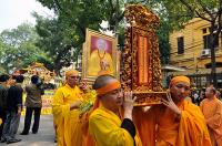| Các nhà sư và Phật tử cùng đi bộ rước thầy từ chùa Quán Sứ đến nhà hát Lớn Hà Nội, sau đó lên xe tiến về Hưng Yên. |
