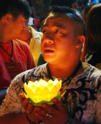 Thành tâm cầu nguyện trước chư Phật với ngọn nến tỏa sáng trên tay