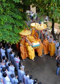 Cung thỉnh nhục thân của Trưởng lão Hòa thượng từ lầu 1 nhà Tổ