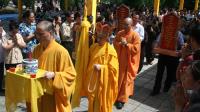 Hàng trăm người dân và phật tử đã đứng chắp tay hai bên đường từ cổng