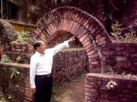 | Ông Ngoang bên một vách mộ Hán lộ ra ở sườn núi Rùa. |