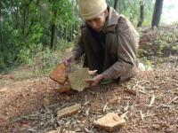| Ông Thớ nhặt cho PV xem những viên gạch xây mộ Hán trên núi Rùa. |