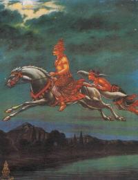 10. Thái tử cỡi con ngựa Kiền-trắc dẫn theo người hầu cận Xa-nặc vượt dòng sông Anoma trong đêm tối