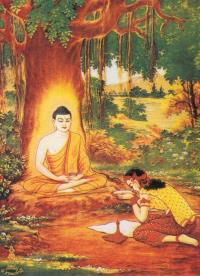 5. Tại buổi lễ Hạ điền, trong lúc mọi người mải mê tham dự lễ và vui chơi, Thái Tử an nhiên thiền định dưới gốc một đại thụ. Trước cảnh tượng uy nghiêm ấy, vua cha và mọi người đã đảnh lễ Thái Tử.