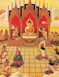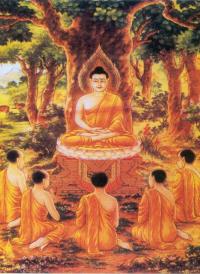 19. Trước tiên, Ngài đến Lộc Uyển tìm 5 anh em Kiều Trần Như là những bạn đồng tu khổ hạnh trước kia để chuyển Bánh Xe Pháp và thuyết bài pháp đầu tiên: Tứ Diệu Đế.