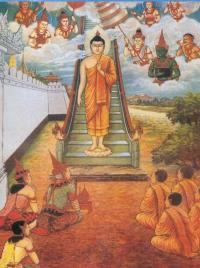 28. Đức Phật dùng thần thông lên cung trời Đao Lợi (Tāvatiṃsa) để thuyết pháp cho thân mẫu.