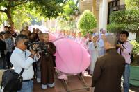 Đoàn xe cung thỉnh hoa sen màu hồng từ từ chuyển bánh từ Học viện