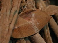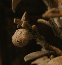 cái lá đang hóa đá dính ở ngang thân cây, gõ vào kêu và cứng như đá,